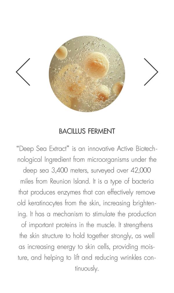 “Skin Restoring Ferment” is a probiotic made by fermenting a type of yeast using Bifida bacteria. The research has shown that it can stimulate the skin to repair DNA, restore the skin to be healthier, reduce sensitivity to external stimuli, reduce the spread of harmful microorganisms through strengthening the microbiome, restore the skin structure to be able to create collagen by itself better. It helps keeping the skin youthful, reducing the appearance of fine lines and wrinkles. The skin looks radiant, clear, with an even skin tone, smoother, more elastic, and firmer. It reduces sagging skin, as well as strengthening the protective barrier and reducing damage from UV rays.